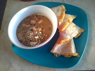 For dinner tonight, I used both Monterrey Jack and Sharp Cheddar cheeses. I run a little stick of unsalted butter around the griddle first and then slapped the tortillas on making sure to get the butter all the way to the edges. I didn't butter the tortilla directly this time because in case you hadn't noticed w all this flavor going on, there is very little fat in this soup, and I didn't want to muck up the works w a greasy quesadilla. Sprinkle as much or little cheese as you want across the tortillas and let the griddle do the work.